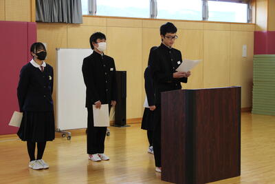 12月24日に2学期終業式を行いました。各学年と生徒会の代表が2学期を振り返り、成果と課題、そして3学期に向けた決意を発表しました。