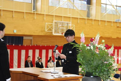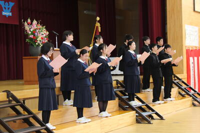 3年前、新しい制服を身にまとい、緊張と不安な面持ちで入学した生徒達は心身ともに大きく成長しました。保護者や地域の皆様が見守る中、胸を張り、今後の目標や決意を堂々と発表する姿に逞しさを感じました。